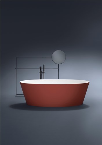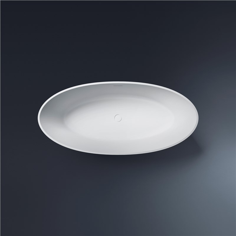The freestanding Alma bathtub is made of solid surface; drain plug included with overflow system. It is available in matt white, glossy white, or in the new bicolor versions.