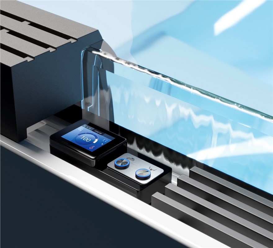 The choice of a glass infinity edge is supported by an innovative design for the spa structure and several technical adjustments that enhance the hot tub's functionality while maintaining the aesthetic minimalist style typical of Treesse spas. The two larger cushions hide the hydro massage controls, which are intuitive and easy to use. When needed, they transform into comfortable seats. With ICE, the relaxation experience becomes even more immersive.