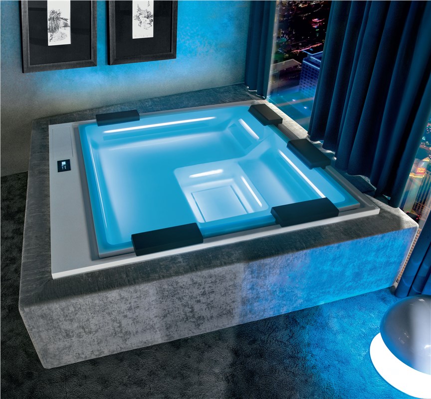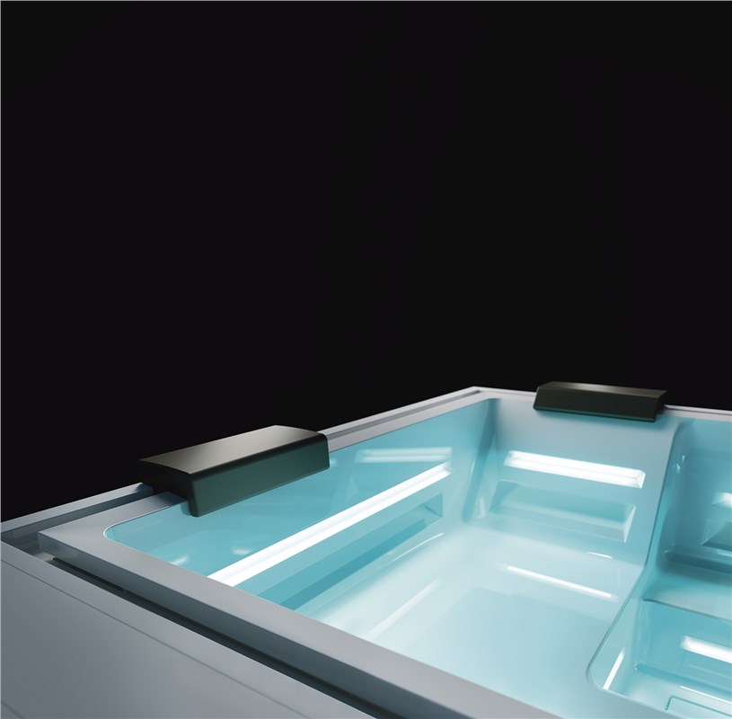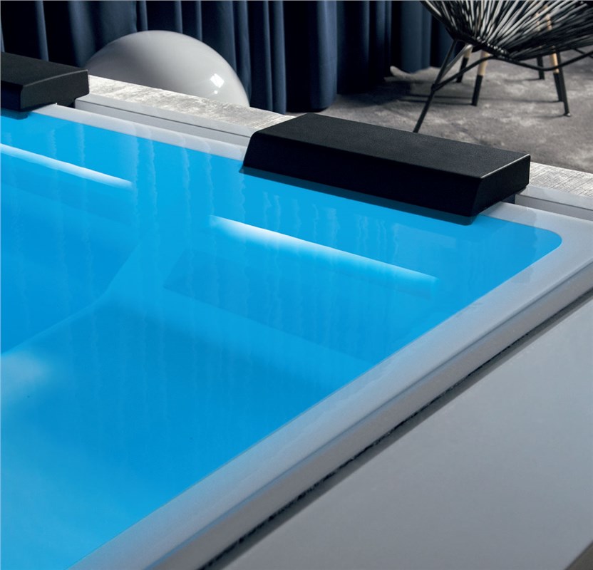 Phantom is built upon the Ghost Plus technology, a brainchild of designer Marc Sadler and an exclusive patent by Treesse. A standout feature of the Phantom spa is the infinity edge skimmer technology with an integrated compensating tank, enhancing the product's aesthetic appeal and ease of use. Multicolored LED lighting replicates chromotherapy effects. A play of light animates the water, providing a soothing and all-encompassing sense of well-being.