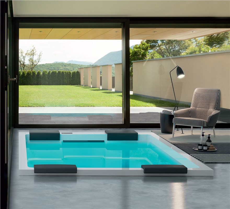 Design takes center stage in this stunning spa, thanks to the meticulous attention to detail and the ability to harmonizes seamlessly with the highest levels of technical efficiency. A major asset of the Maya mini-pool is the innovative Ghost technology, an exclusive Treesse patent, designed by Marc Sadler. This technology renders the whirlpool invisible within a slender perimeter groove that also houses multicolored LED lighting. Another bonus of Ghost technology is chromotherapy. The water is gently stirred by a stream of colored light, enhancing relaxation in a consistent and immersive manner, while helping to alleviate anxiety and stress.